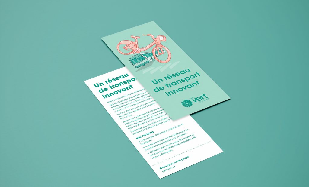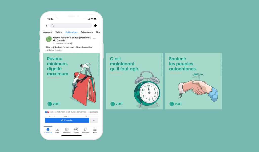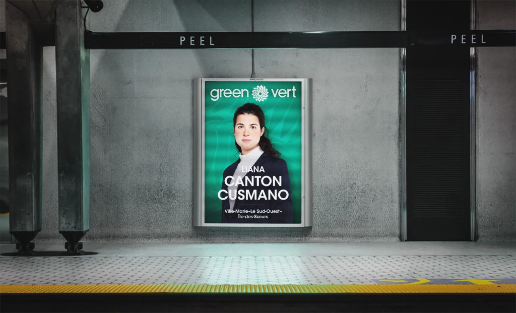 À seulement un mois du déclenchement des élections fédérales de 2019, le Parti vert du Canada nous a approchés pour concevoir son matériel de campagne au Québec. En tant que directeur créatif, j’ai supervisé l’ensemble du processus, de l’idéation à la mise en œuvre, en veillant à ce que chaque élément, pancartes, tracts, microsite et visuels pour les médias sociaux, reflète la personnalité et les valeurs du parti.